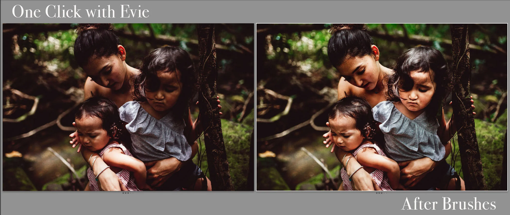 You can see it’s about 10 am, but my subjects are in full (ish…it’s a rainforest afterall) shade. Both the light and the tone of skin are all varied causing the preset to dim everyone’s shadows a bit differently: