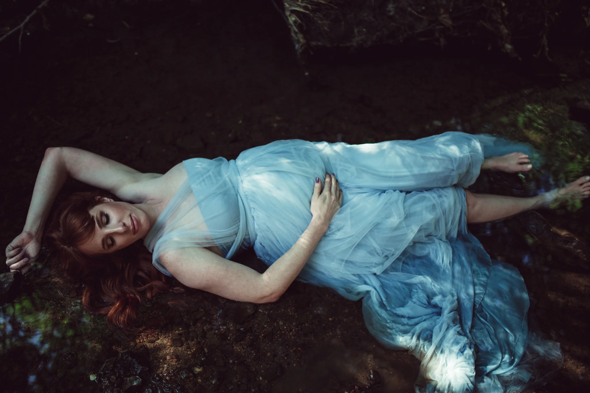 I had the deep honor of photographing two mamas in waiting for my portion of the project. First time mama Jess ran away to the creek with me and dreamed in the water.